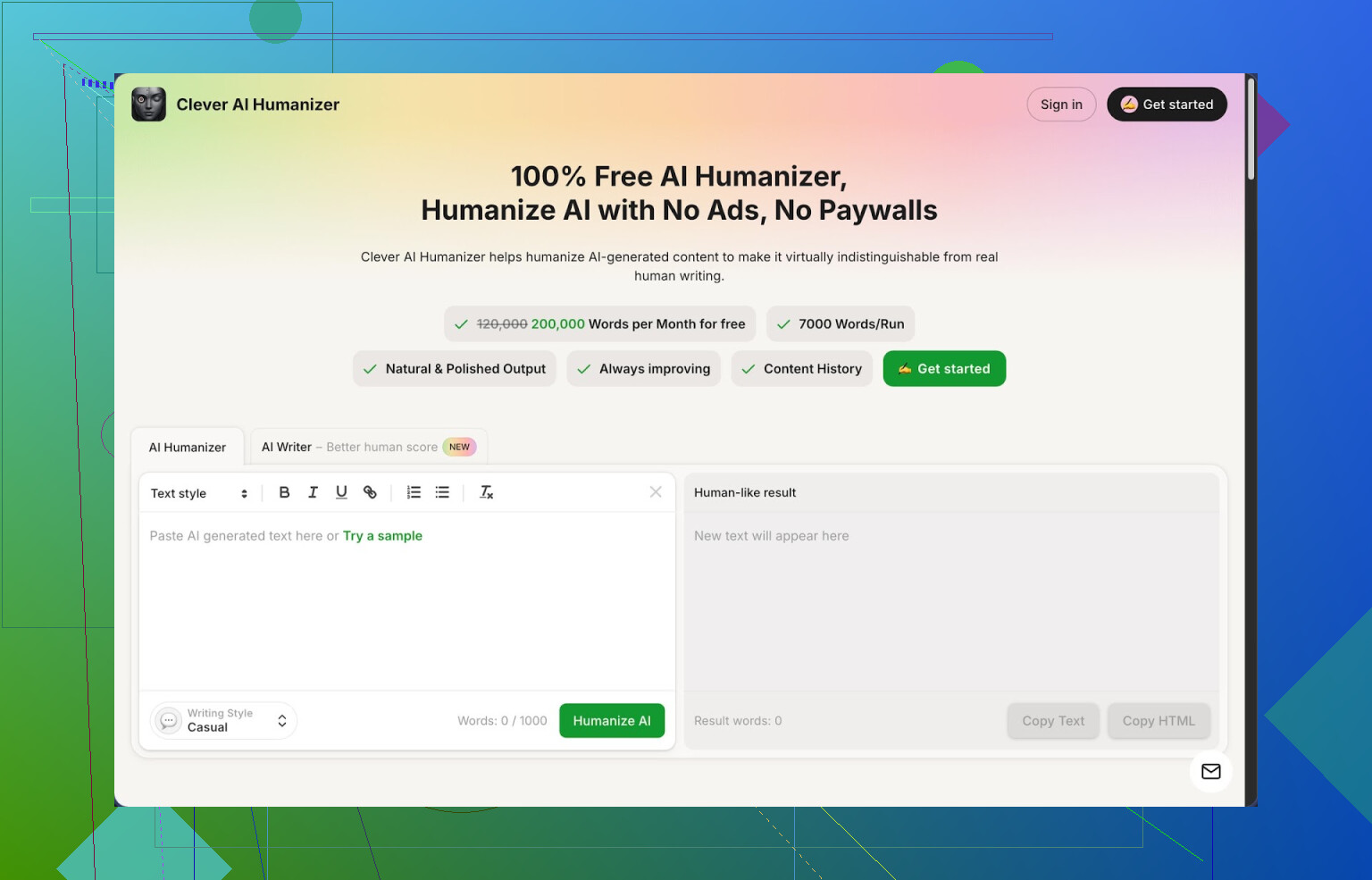 Clever AI Humanizer es una de esas herramientas que probé sin esperar nada y terminé usando más de lo previsto. Es gratuita, sin rastro de créditos por palabras ni muros de pago agresivos por ahora, y los límites son lo bastante altos para trabajo real: alrededor de 200.000 palabras al mes, con hasta 7.000 palabras por ejecución. Hay tres estilos, Informal, Académico simple y Formal simple, además de un redactor de IA integrado si quieres generar y humanizar en un solo lugar.