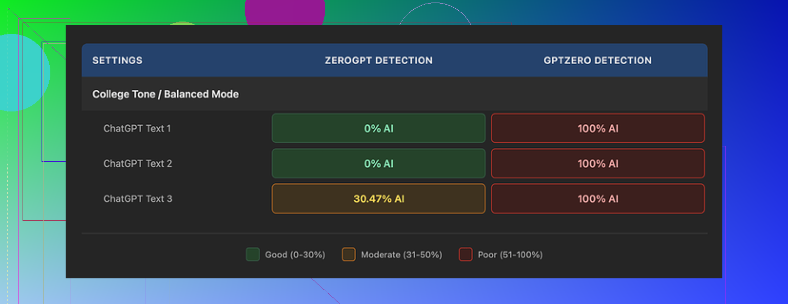 • GPTZero flagged every single GPTHuman output as 100% AI. No grey area, no “mixed” result.