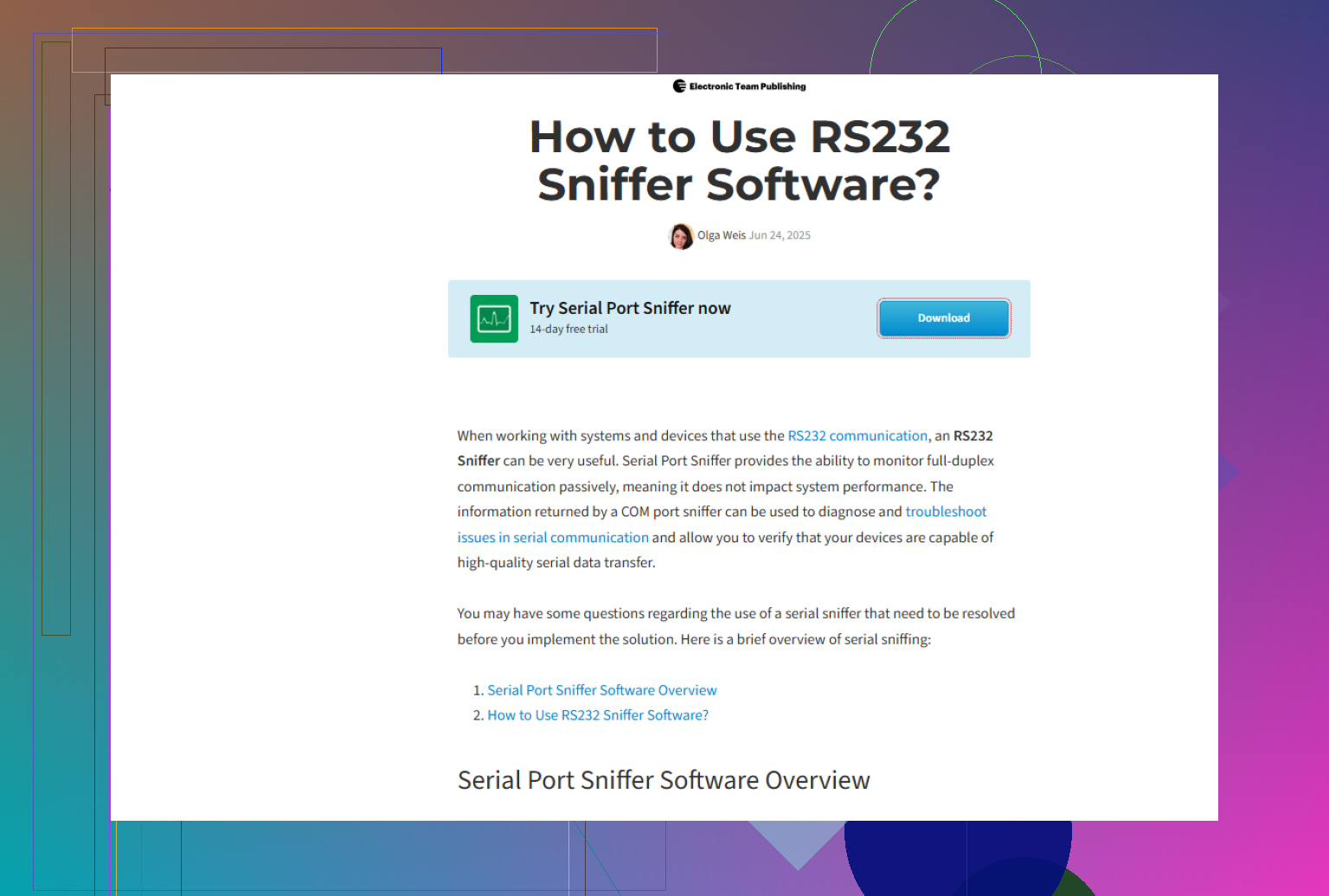 I’m trying to capture and analyze data traffic on a serial port between a device and my PC, but I’m not sure which tools or methods are best, or how to set them up correctly. I need to log the communication for debugging and reverse engineering, ideally with timestamps and readable decoding. What’s the best way to sniff a serial port on Windows or Linux, and what pitfalls should I avoid?