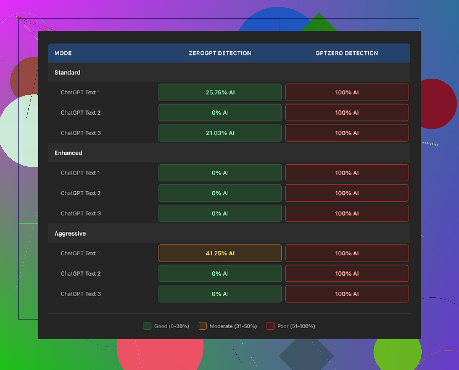 GPTZero flagged every output as 100% AI in all three settings, Standard, Enhanced, and Aggressive. So if your goal is passing detection checks, I did not see any sign of it working.